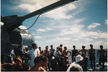 |  Les marins des services « Intérieur » et « Artillerie » de l'aviso-escorteur Amiral Charner au mouillage à Moorea, Polynésie française (Avril 1979 - Photo J-Pierre Monmasson).