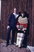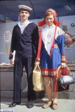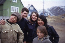 BOUGUENNEC avec une jeune danoise en costume traditionnel groenlandais. Campagne 1969 ou 1970.