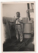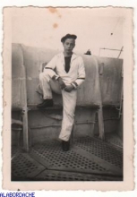 Le matelot timonier René Hélou sur l'aileron babord de la passerelle.