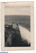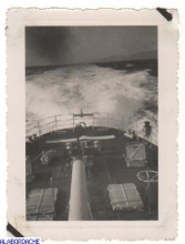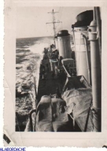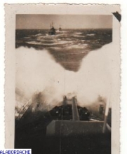 Le sillage de l'Albatros à grande vitesse (l'Albatros a atteint aux essais la vitesse de 41 noeuds). Au premier plan, le tube de la pièce n°5 de 138 mm.