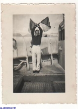 Le matelot timonier René Hélou transmettant un message par signaux à bras.