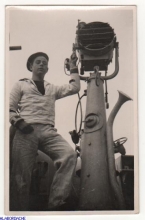 Le matelot timonier René Hélou à côté d'un projecteur de "Scott".