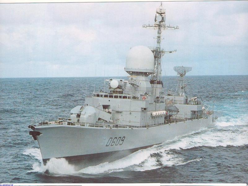 L'ex corvette Aconit (D 609) rebaptisée frégate, à la fin de sa carrière. Des Missiles MM 40 ont remplacé derrière la tourelle de 100 mm, le mortier ASM de 305 mm