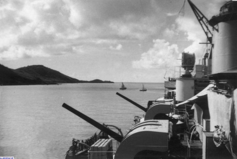 Golfe du Siam, avril 1950. On distingue 2 pièces de 100 mm AA et un projecteur. Sur la cheminée les supports d'antennes en "oreilles de lapin" ont remplacé le mat arrière.