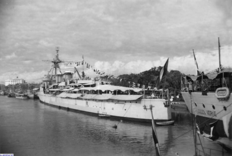 1950 : Le croiseur Dugay-Trouin à Saïgon. plusieurs dragueurs de mines YMS sont accostés sur son avant. Derrière lui, le bâtiment atelier Jules Verne.