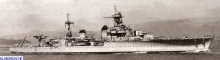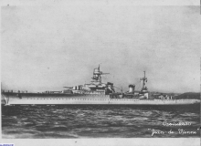Croiseur Jean de Vienne pendant la guerre d'Espagne ou à partir de l'armistice de juin 1940. Les marques de neutralité sont peintes sur ses tourelles 2 et 3.