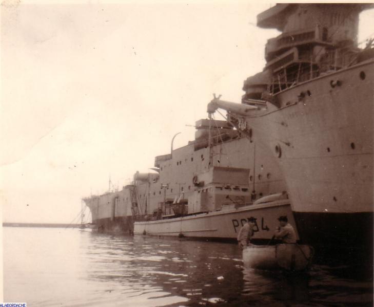 Le Richelieu à Brest au début des années 60. Ponton école, il abrite l'école des manoeuvriers et le cours de EOR (élèves officiers de réserve). A couple un ex chasseur de sous marins l'US Navy de qui sert de bâtiment d'instruction à la mer. et le voilier ex allemand Dûchesse Anne. Deux apprentis gabiers godillent sur un youyou. (Commentaire Daniel Maurice. Photo X DR)
