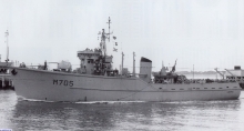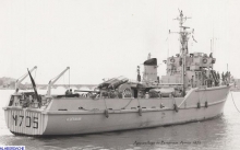 L'Aldébaran en 1958. Le pavillon national frappé sur l'arrière du roof de drague s'est enroulé. Cet emplacement est inhabituel. Quand les dragueurs côtiers entraient au port, le pavillon de mer (taille 15) à la corne du mat était rentré et un pavillon national de plus grande taille (14 en semaine, 13 le dimanche, parfois 12 pour les grandes occasions...) était hissé au mat de pavillon, au tableau arrière du dragueur. (Commentaire : Daniel Maurice, ancien timonier)