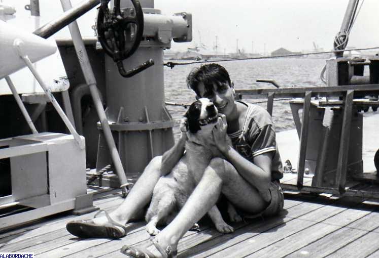 Campagne 1965-1967 : Dakar . Sur la plage arrière du Canopus, le QM2 élect Federicci avec "Domino", la mascotte du bord.