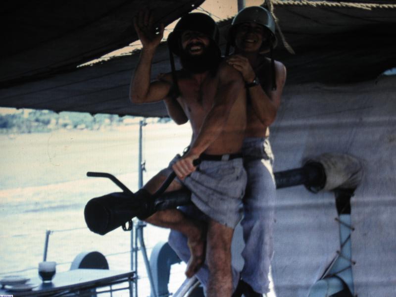 Le QM cannonier Jacques Vevollet, Ã l'aise sur le tube de son canon "Beaufort" de 40mm.