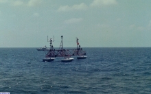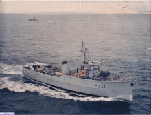 1976 : Le patrouilleur Eridan à la mer au large d'Arcachon. On peut apercevoir la dune du Pilat et le patrouilleur Trident qui fait ses premier essais à la mer