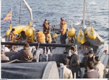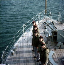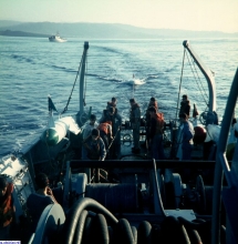 1969 : Poste de drague. L'équipe de plage arrière file le brin de drague qui pemettra de former la boucle de la drague magnétique. Derrière le Verseau, peut être un dragueur de mines allemand ?