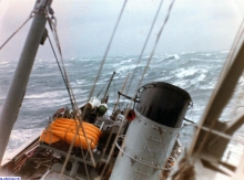 Le Verseau vers 1975 dans la tempête, par mer du travers.