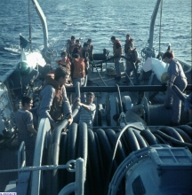 1969 : Poste de drague. L'équipe de plage arrière file les cables d'alimentation électrique de la drague magnétique (le plus gros) et de la drague acoustique (le plus fin). C'était une manoeuvre délicate et qui pouvait être pénible et dangeureuse quand la mer était formée. Mais heureusement, si l'on peut dire, on ne pouvait pas draguer quand elle était trop grosse.