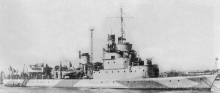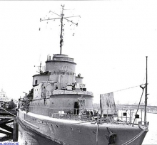 Le commandant Dominé, à droite, en compagnie du Commandant Delage, au chantier Caillard du Havre, en mai 1961, au début de leur démolition.