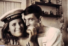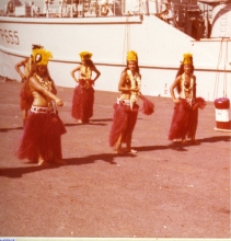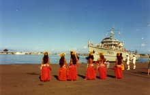 1977 : Accueil de la Dieppoise à Papeete par les traditionnelles et ravissantes vahinées.