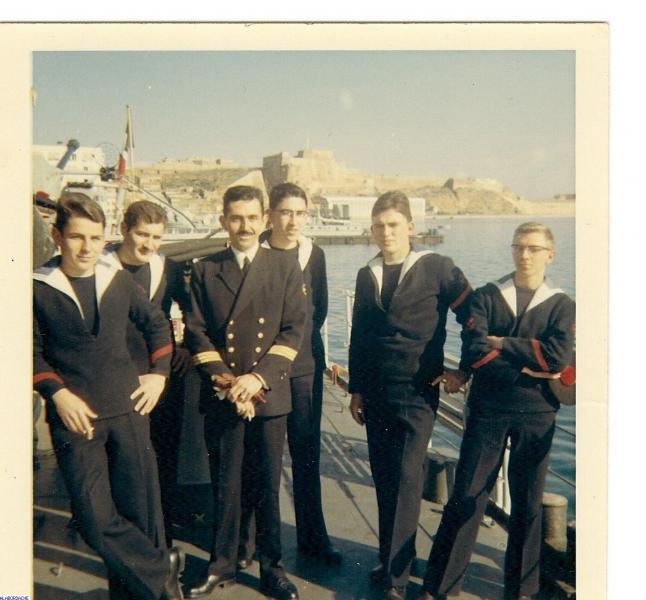 Le 31 décembre 1966 à Mers el Kébir : Les QM et Mlots Cortijo, Nicolas, Plagellat, Renaud et Gillard entourent le MT Coquin.