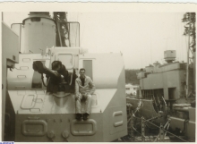 1966 :"Tartarisé", le Bouvet a perdu ses 3 tourelles doubles de 127 mm d'origine. Il a conservé uniquement 3 tourelles doubles de 57 mm. 1 à l'avant et 2 derrière le seconde cheminée. Ici, sa tourelle tribord.