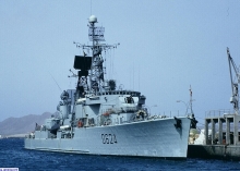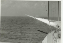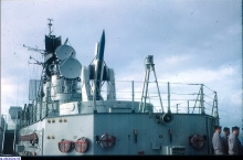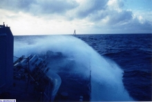Essais de vitesse au large de Brest à plus de 32 noeuds. Au premier plan, la rampe des missiles Tartar.