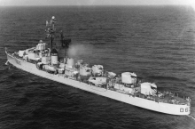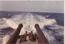 Le Forbin à grande vitesse. Vue de la plage arrière, les 2 tourelles doubles de 127mm.