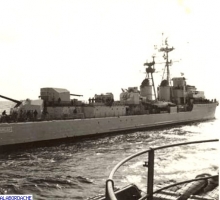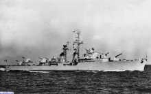 Le Surcouf aux essais en 1955. Il est le premier navire de combat d'un tonnage important construit après la guerre et tête d'une serie de 18 escorteurs d'escadre (12 T47, 5 T56, 1 T62)