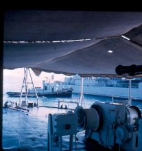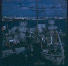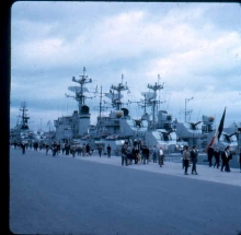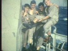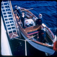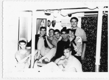 |  Equipe de réception du Béarnais. Faisant office de commis j'étais le responsable avec le ''toubib'' de l'accueil des invités à bord et je m'entourais de copains évidemment. A Weymouth lors d'un des premiers voyages inaugural nous avons ramené à terre la fille dumaire qui avait un peu trop abusé de champagne ! septembre 1958 ?