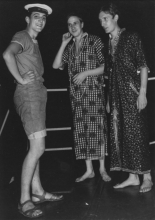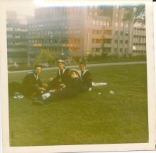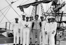 Juin 1957, lors d'une escale en Virginie (USA), quelques marins du Gascon entourent le fantôme (bien vivant) d'un gabier qui naviguait à bord d'une des 3 caravelles, la Nina, la pinta ou la Santa maria, de Christophe Colomb. (Photo : Jean Salducci, QM2 élarm, embarqué sur le Gascon de mai 57 à mai 60)