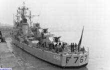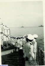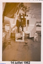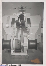 Le 14 juillet 1962 : Le Gascon arbore le grand pavois et les tapes de bouches en cuivre sont à poste sur les canons de 57 mm. La plage arrière est "nickel". Un permissionnaire est paré pour une sortie à terre.