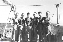 Juin 1957. Retour du défilé naval aux Etats Unis: Les joyeux drilles du poste 3 (plat 31) sur la plage arrière du Gascon. A cette époques les escorteurs rapides pouvaient être grées pour le draguage des mines à orin comme en témoigne le flotteur divergent ou "paravane", dont on voit l'arrière, à droite de la photo. (Commentaire : Daniel Maurice. Photo : Jean Salducci)