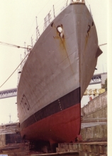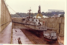 Après avoir passé plusieurs mois à la mer, le Gascon en cale sèche à brest va se refaire une jeunesse... (Photo : QM2 Mécan Gérard Bodet, le 19 juillet 1973)