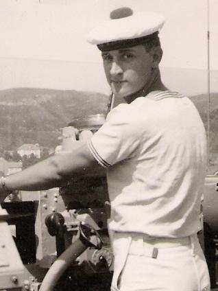 1964. Pierre Virmes à la passerelle du Lorrain à Toulon. Le Cap. de Corvette Brac de la Perrière était le pacha et venait de succéder au Cap. de Corvette Georges de Castelbajac. Deux grands pachas. La classe !
