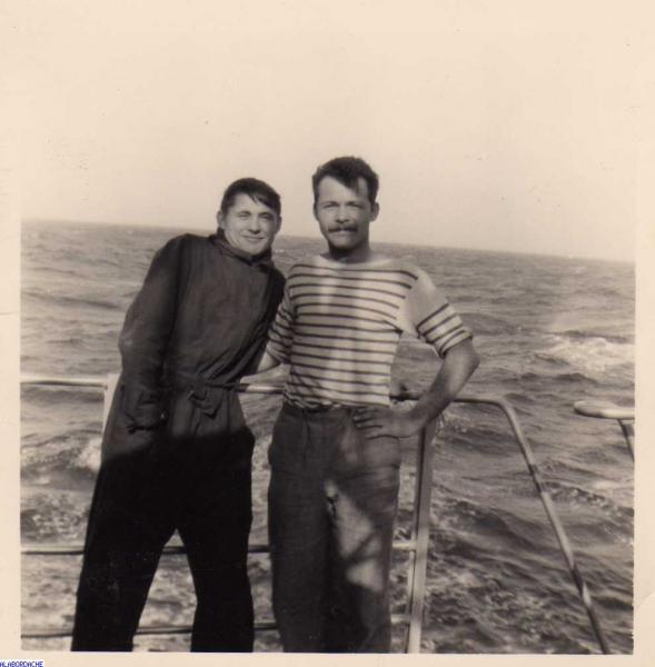 1959. En mer. Le matelot revêtu du tricot rayé et l'armurier du bord. Quant à moi je me trouve à ses côtés. Matelot mécanicien Pierre CARDIN.
