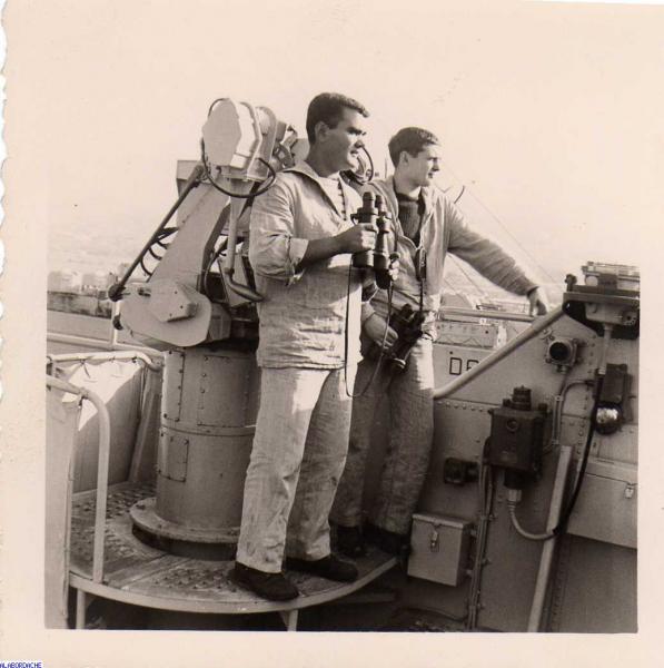 1959. Mers el Kébir (Algérie). Ibanes et moi à la passerelle du E.R. Le Lorrain (Photographie; matelot mécanicien Pierre Cardin dit; "Nîmes".
