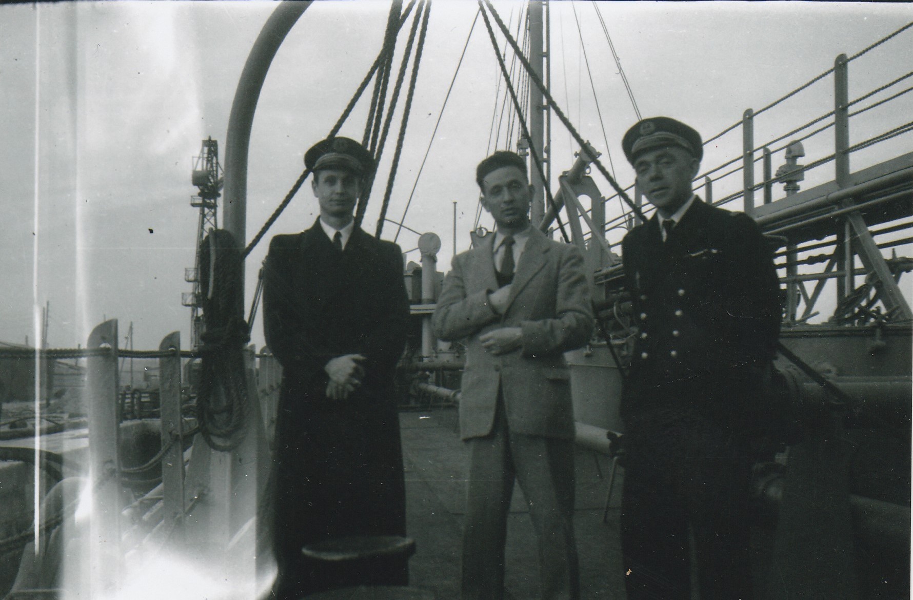 Photo prise en Mai 1952, ça a tout l'air d'être sur un pétrolier ravitailleur, à Gauche mon père Médecin de la Marine Nationale. Je cherche à savoir qui pourrait être ce civil ?