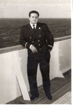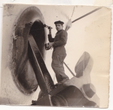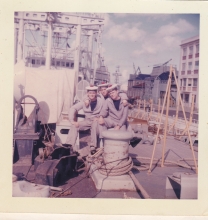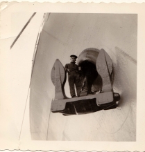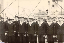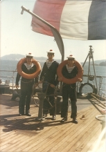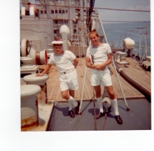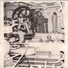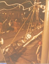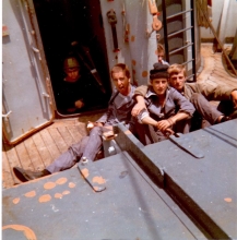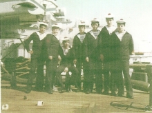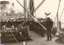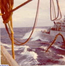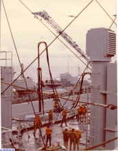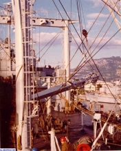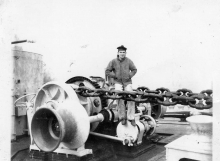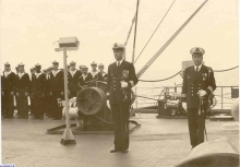 1. RAM avec l'escorteur tapide E52B l'Alsacien. Le poste de RAM est au pied de la passerelle et de la cheminée "Strombo-Valensi" (ou dîte "en aile d'avion"). Ce type de cheminée profilé fut mise en place, d'abord sur l'E.R. E50 Le Bordelais, puis sur les 3 E.R. E52B Le Vendéen, l'Alsacien et le Provençal. (Commentaire Daniel Maurice) (photo X)
