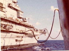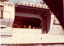 RAM avec le CLEMENCEAU. On distingue l'intérieur du hangar sous l'ascenseur latéral.