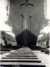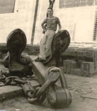 1961 : En cale sèche. Une ancre et sa ligne de mouillage est en cours de visite avant d'être repeinte.