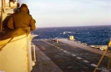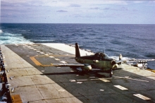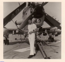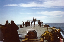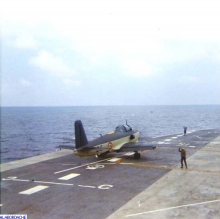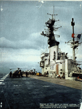 1962 : Sur le plont d'envol de l'Arromanches, devant un "Corsair".