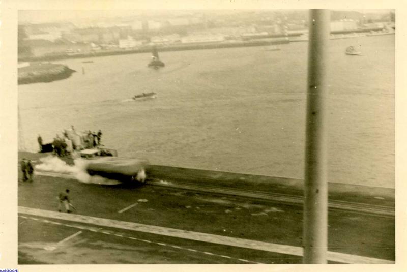 Brest. Grand carénage 1967 : Catapultage d'une "maquette" par la catapulte latérale.