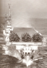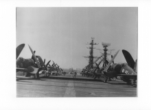 Corsairs et TBM3Ws se parkent a l'avant du pont d'envole. Observe les deux catapultes.