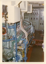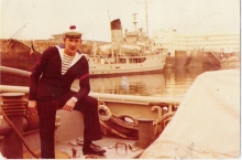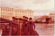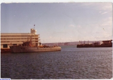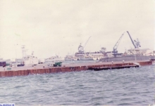 Vue de la plage arrière du Lutteur, à son poste à quai habituel dans le port de cherbourg en 1974.
