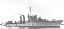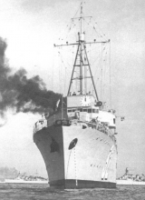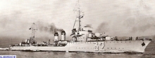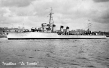 1934 : La Trombe liors d'une revue navale. Au second plan les croiseurs de 7.500 tonnes Duguay Trouin et Primauguet.