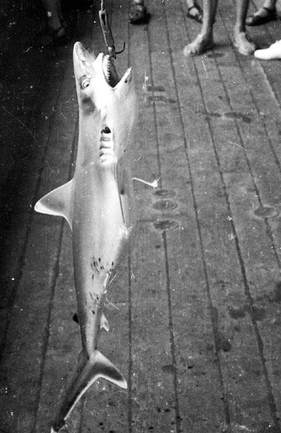 |  Le cuisinier du bord ( "Marseille") à appâté un requin avec du beaf à l'île de Vanikoro. Equipage consigné à bord ! (sur les tracs de La Pérouse)