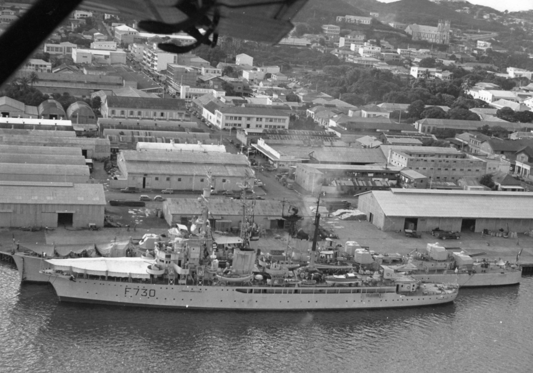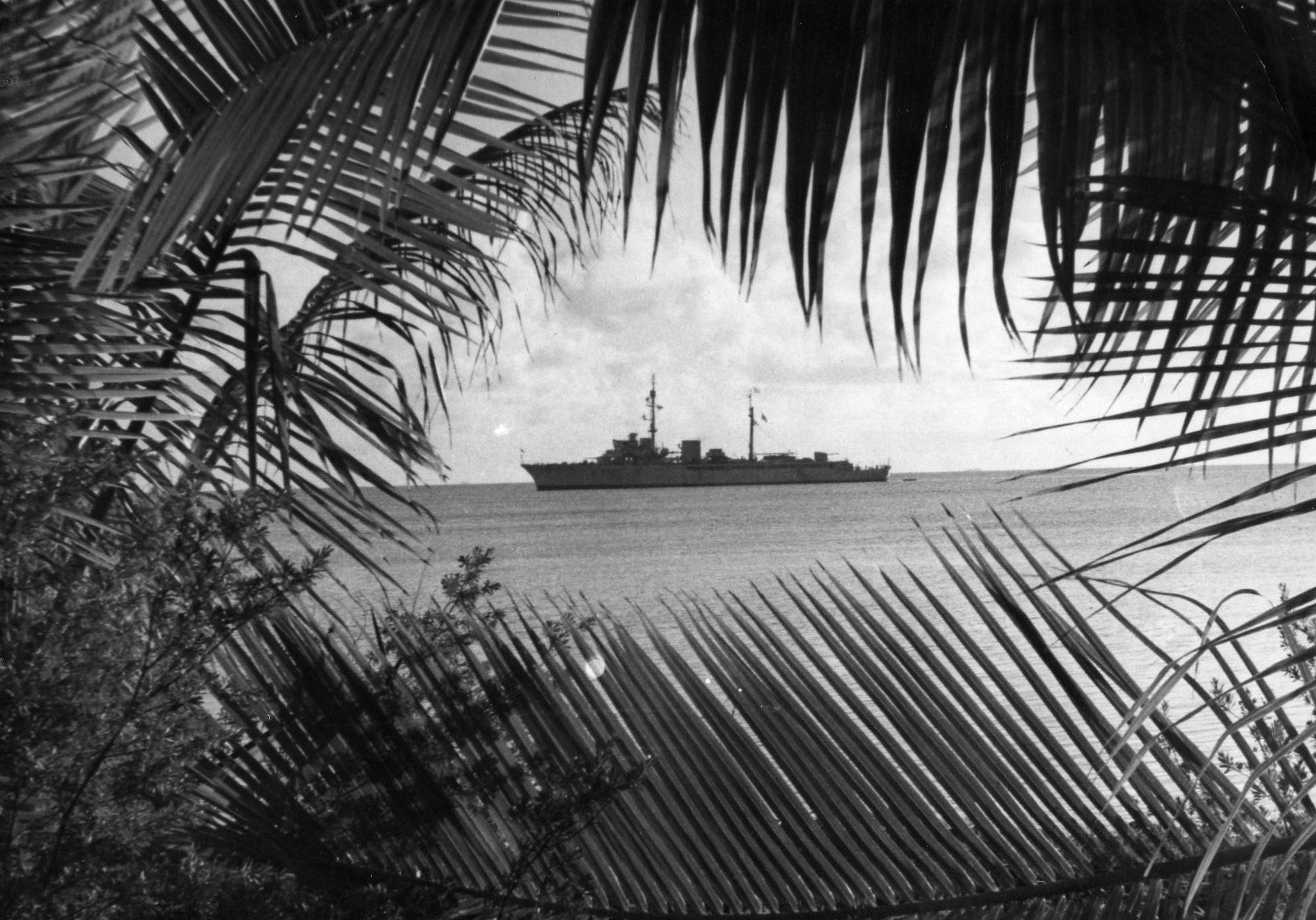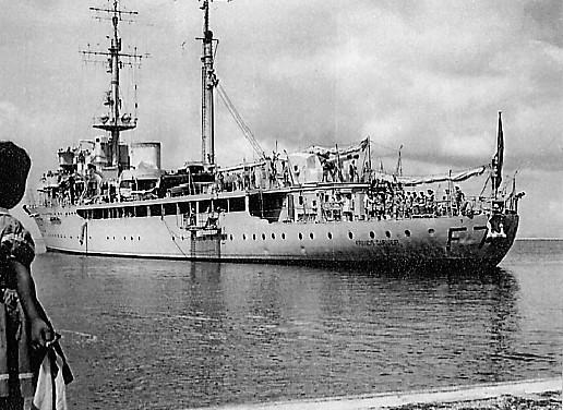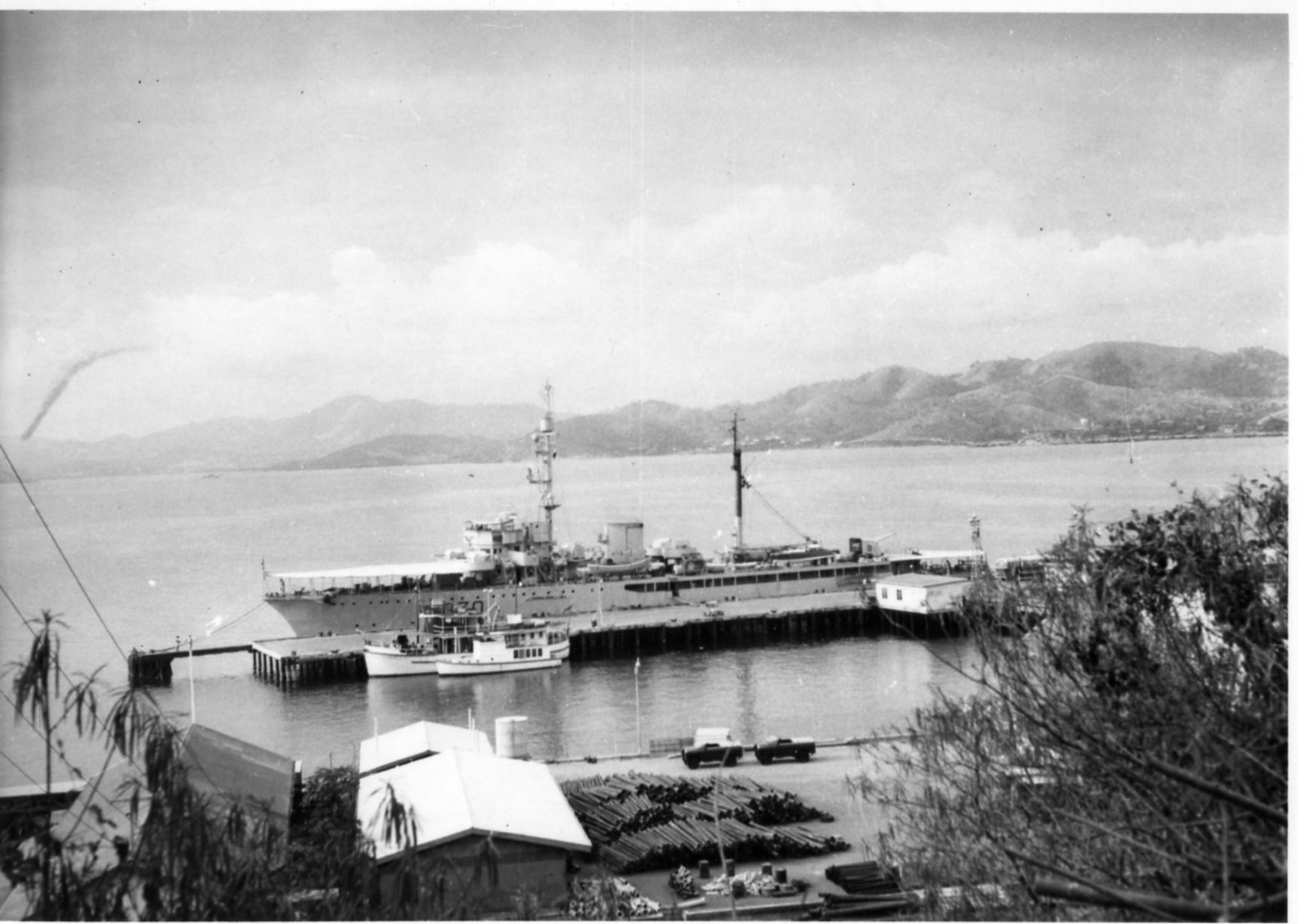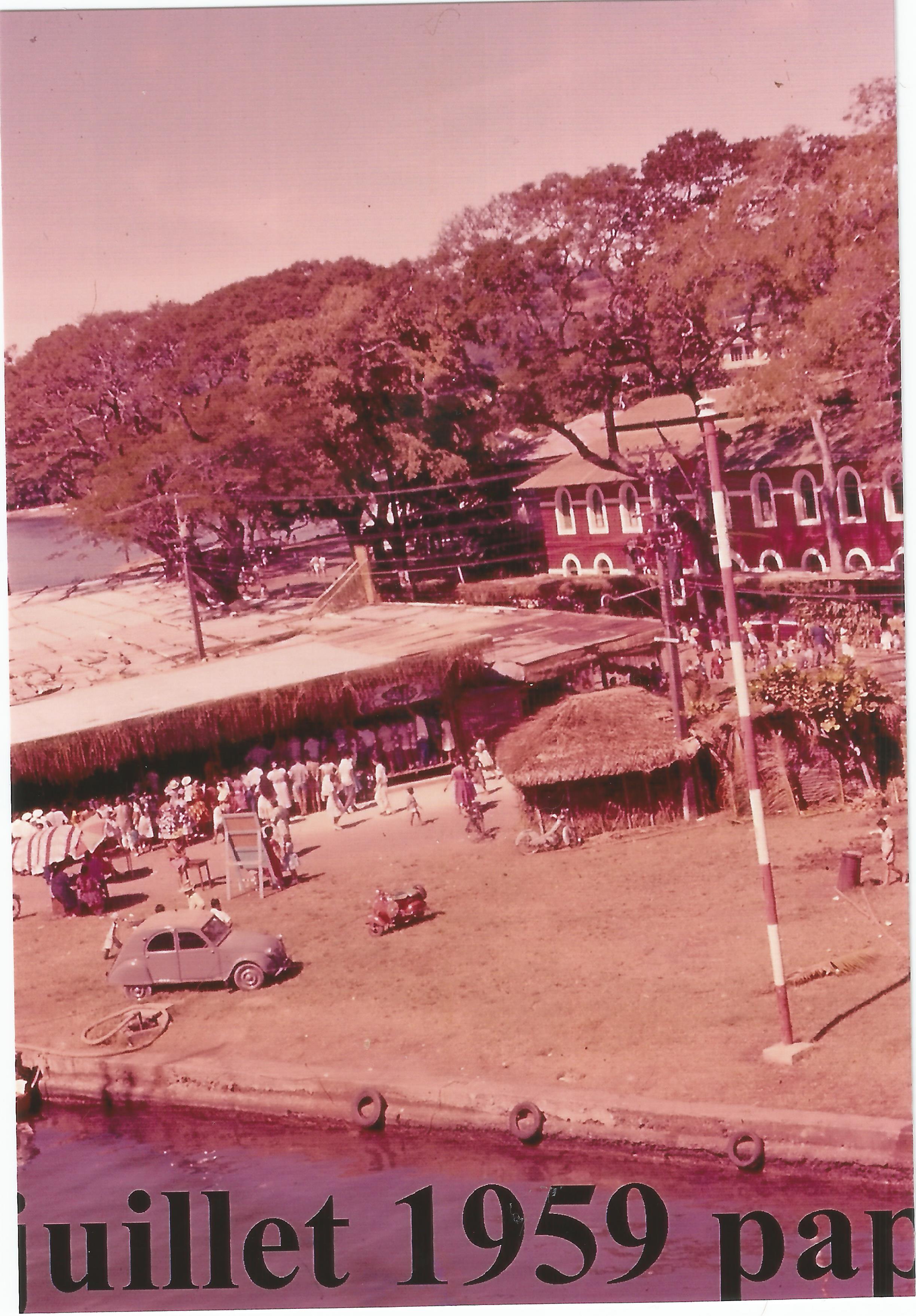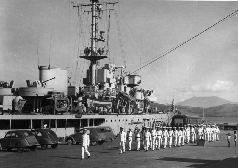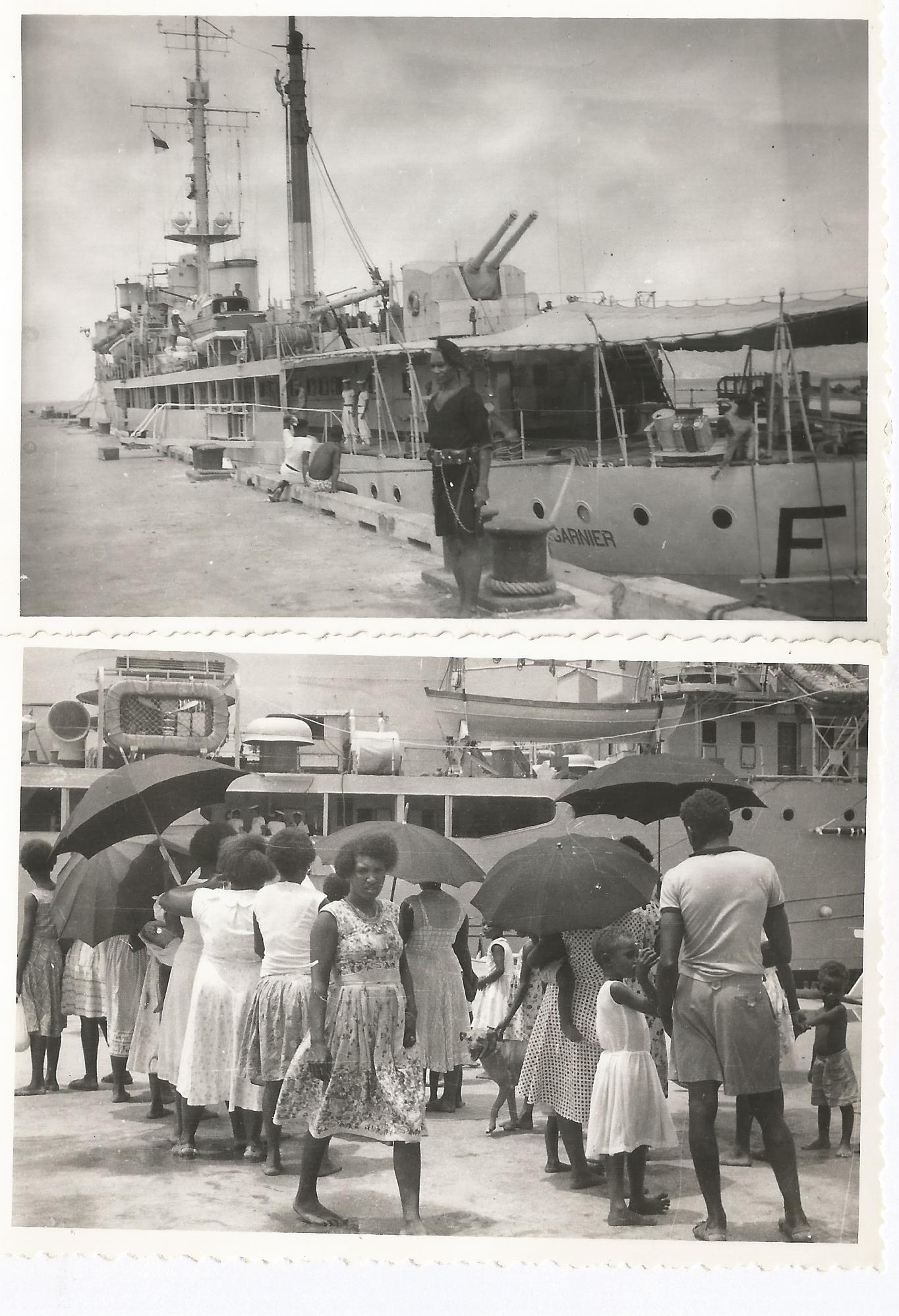 L'aviso francis GARNIER, à quai à Nouméa ( Nouvelle-Calédonie ) en 1957 pavoisé pour la fête du 14 juillet. Sous le commandement de l'amiral De Toulouse-Lautrec.