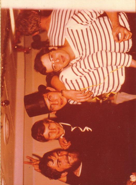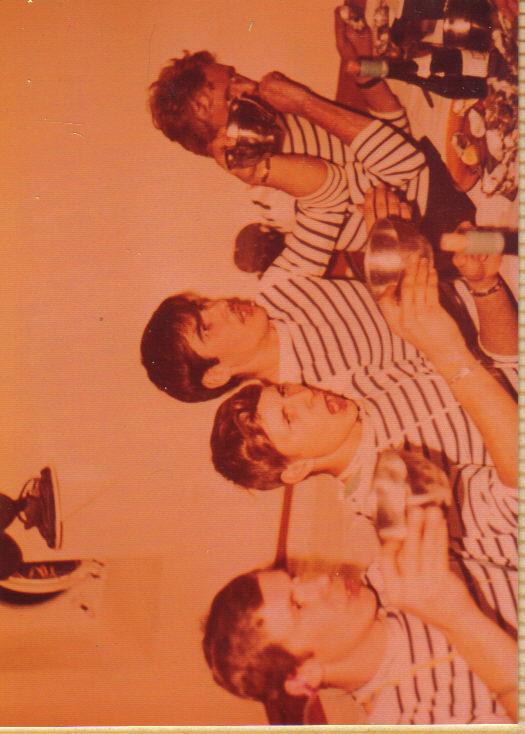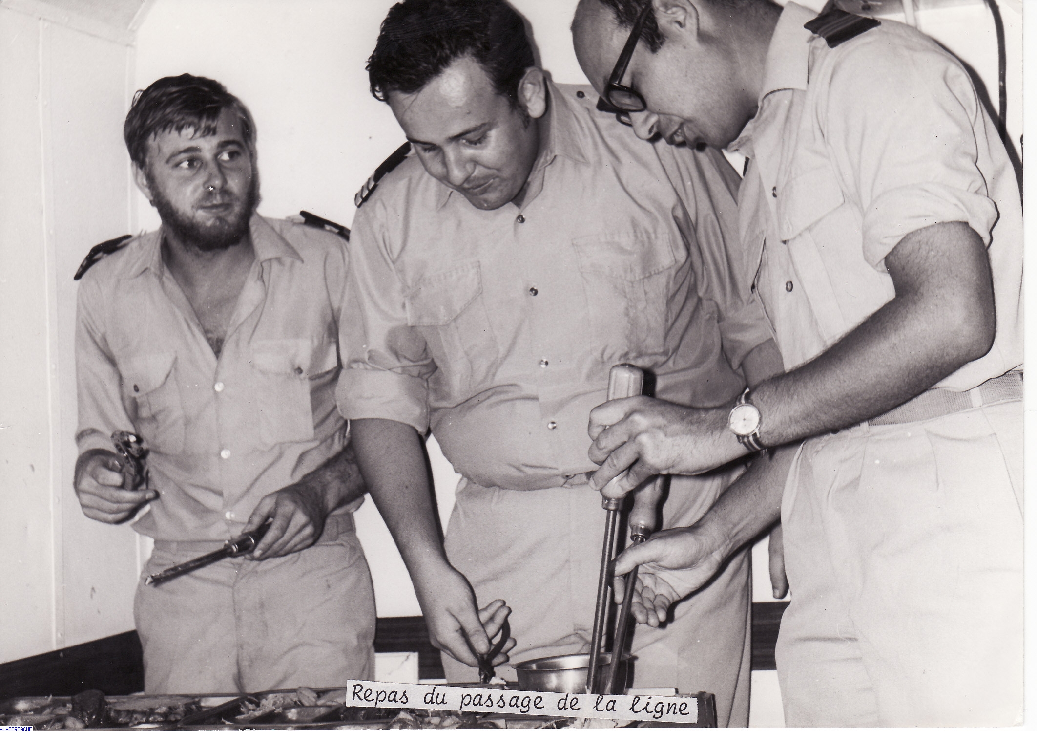 |  Passage de la ligne -8/12/74 - Médecin LATERRIERE - Mtre LEDROUMAGUET et SM GONZALEZ - repas frugal- (photo A. LETULE)