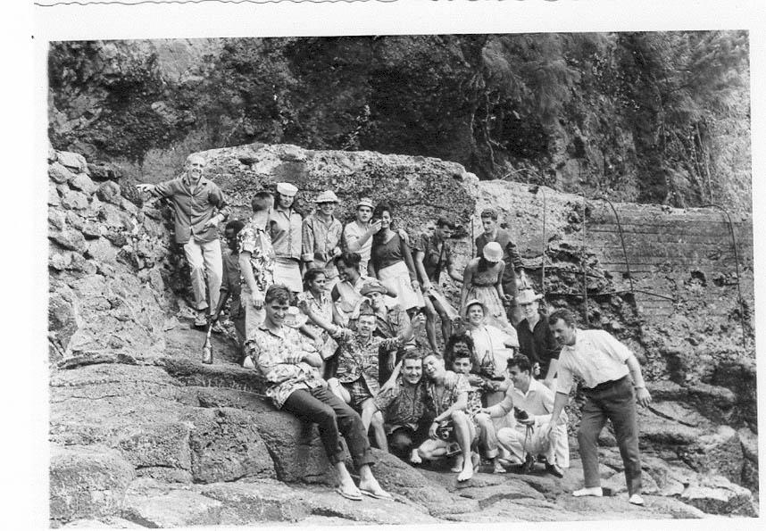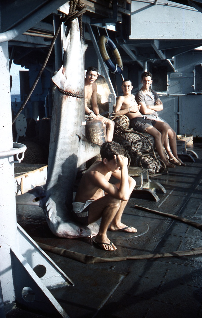 Année 62/63 Pêche aux requins aux iles Marquises Je suis assis sur la tête du requin Jacques BERNARD Cuisinier sur La Capricieuse