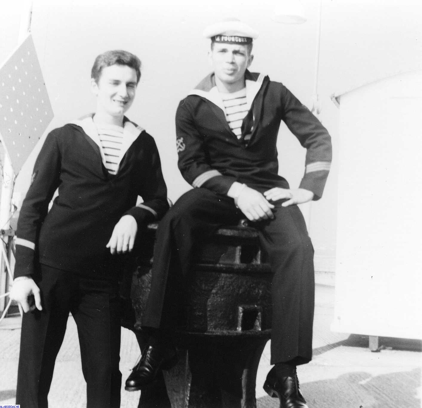 Equipage LE FOUGUEUX - Port de Hull ( UK) De G à D : QM2 mécanicien Christian Frémont et QM1 Dumazel. Campagne d'assistance des pêches, septembre 1968