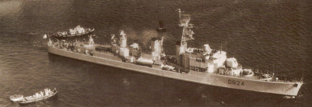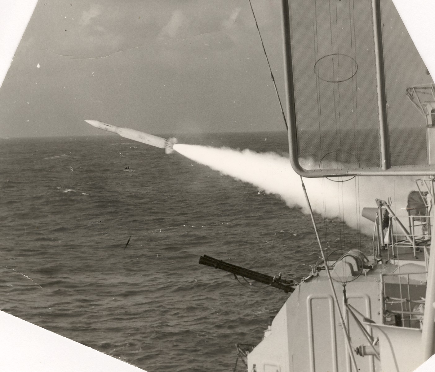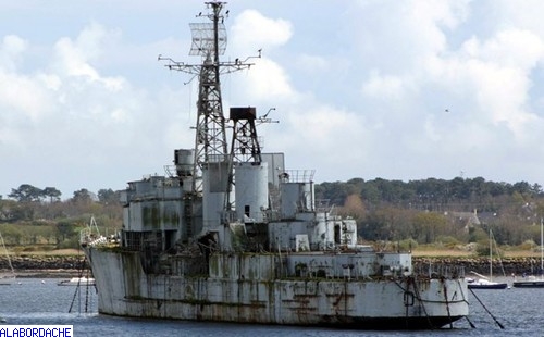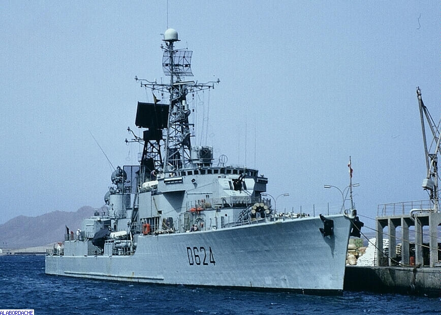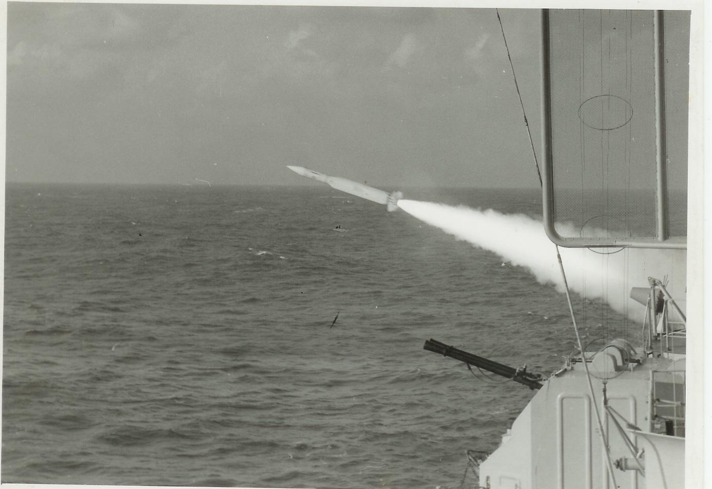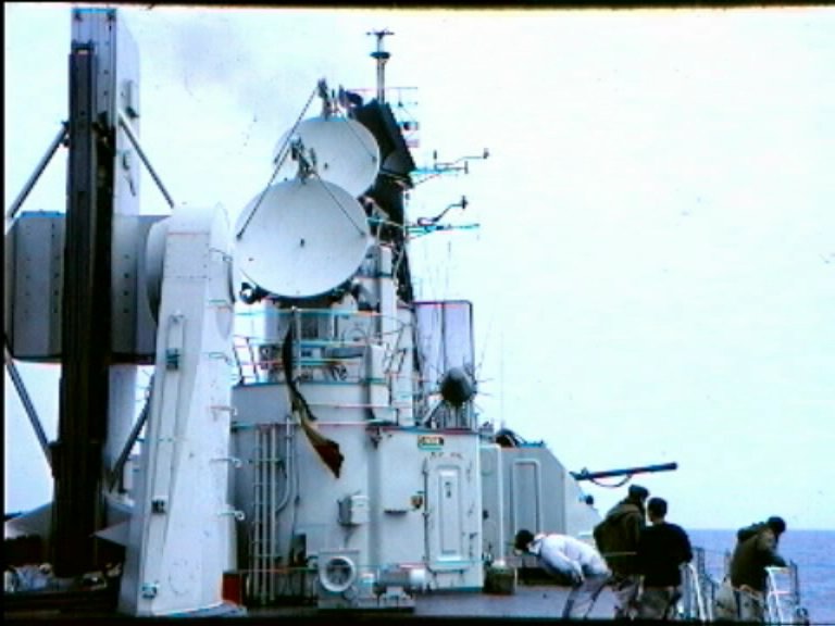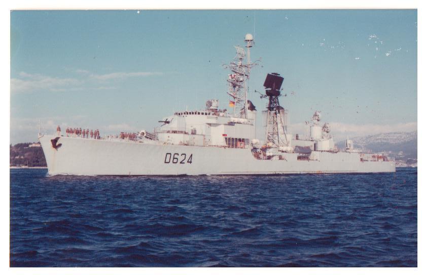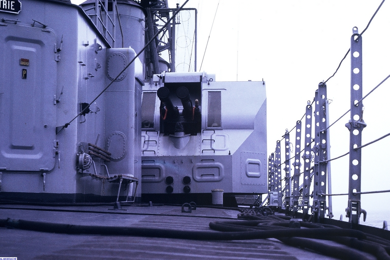 |  Plus de 32 noeuds: essai de vitesse à Brest. Au premier plan, la rampe des missiles Tartar