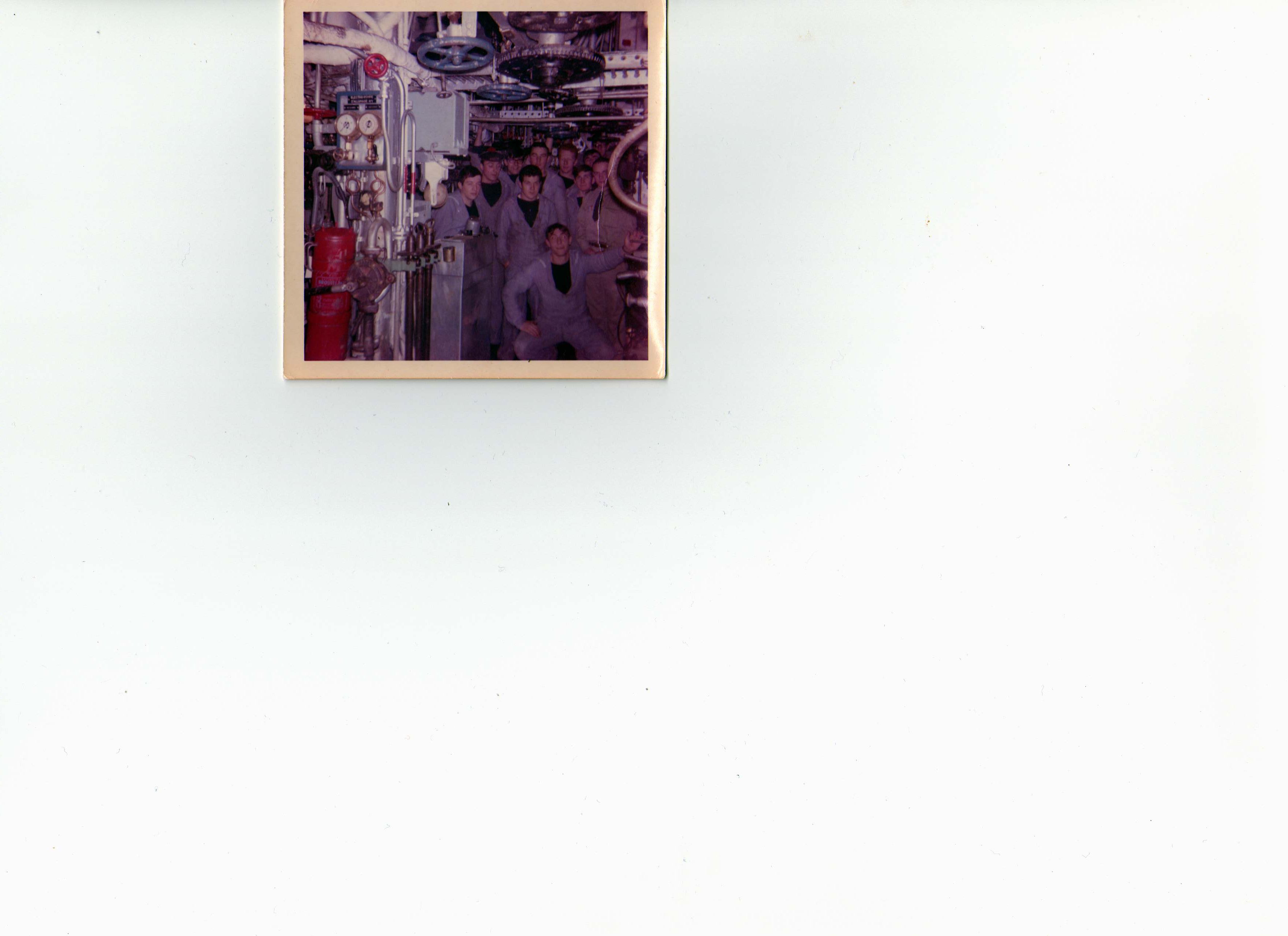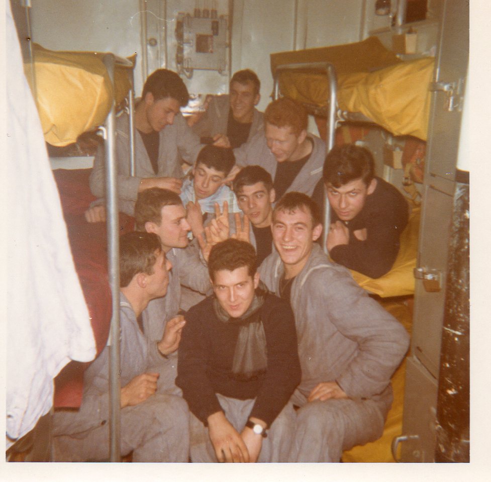 |  La chaufferie avant ou l'on peut reconnaître en partant de devant Mico,Evrard,Plougastel,le second maître Le vey,Bediat,Lebrédonchel,Kervella,Beaufils,Rocques,Moreau,et Auvray tout au fond,mars 1969