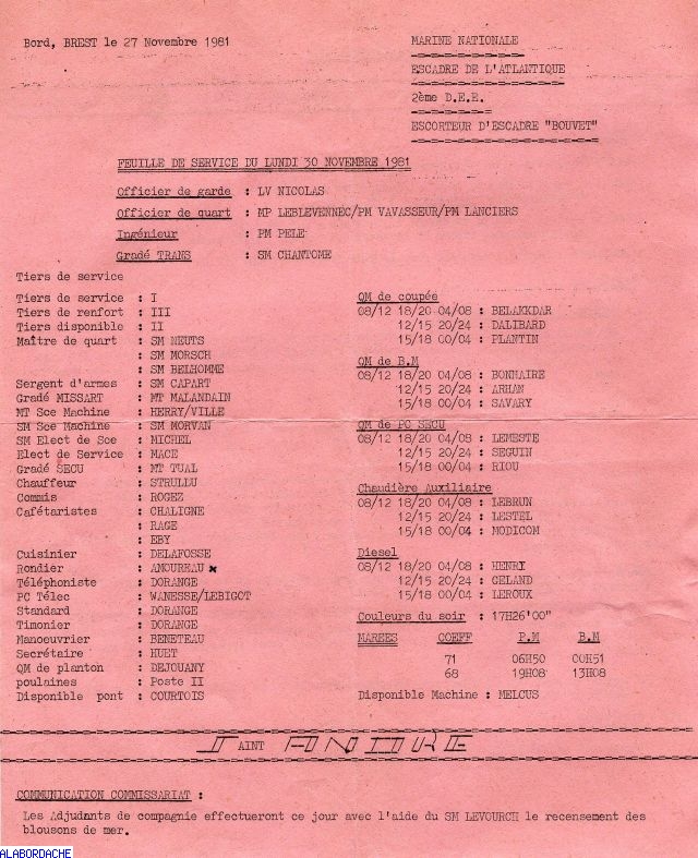 |  Feuille de Service Novembre 1981 sur le Bouvet